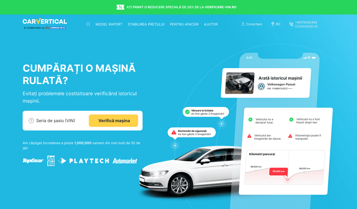 Rapoartele carVertical lasă impresia unei analize amănunțite a istoricului fiecărui vehicul verificat. Cuprind date care acoperă atât informații despre mașina propriu zisă cât și despre probleme generale ale modelului verificat. Un raport carVertical este ca și cum aveți un mic manual al mașinii verificate, complet cu informații vitale, precum daunele suferite și citiri de odometru din trecut, plus un mic ghid despre ce să verificați cu atenție și când să vă așteptați la următoarea revizie.